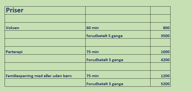 Til gengæld holder jeg mine priser lave, så unge mennesker og familier med behov nemmere kan komme til. Har du spørgsmål, så skriv eller ring endelig.